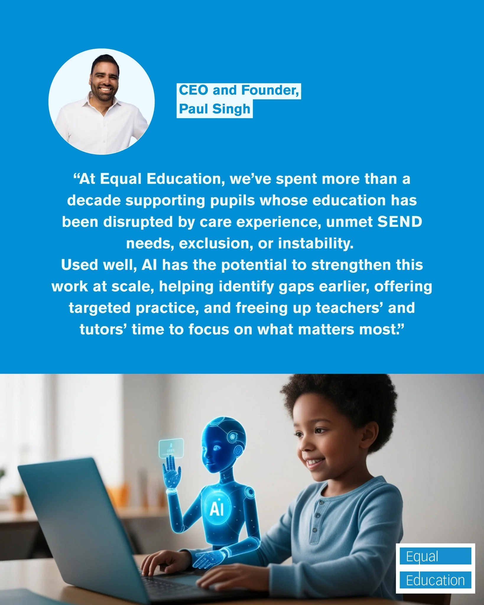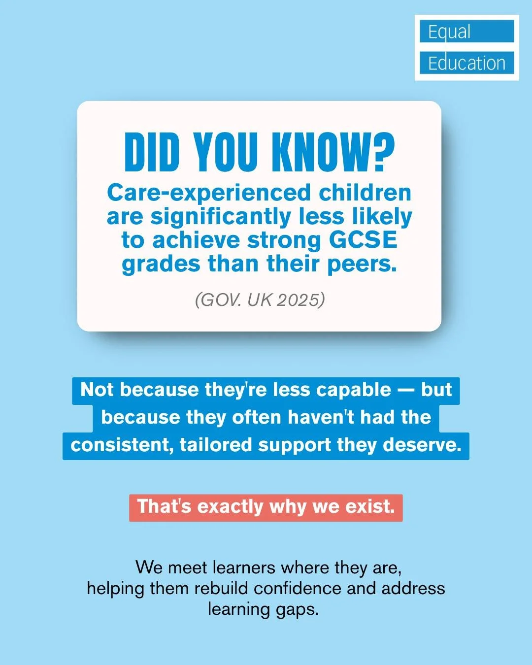 Equal Education is a social enterprise connecting qualified teachers with under-resourced students, including Children Looked After (CLA), those with Special Educational Needs and Disabilities (SEND), and Unaccompanied Asylum-Seeking Children (UASC), for specialist 1:1 tuition.